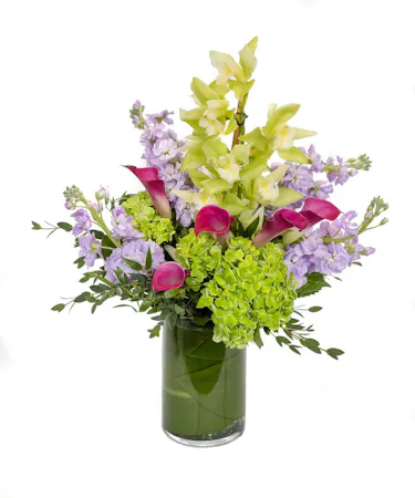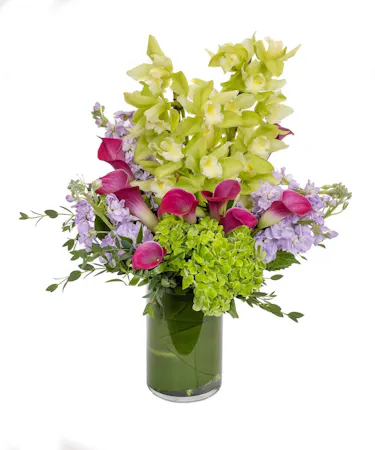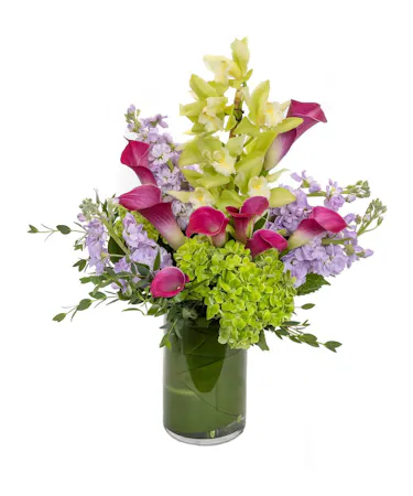With lovely spring colors and unique beauty, this design keeps its allure all day long. The calla lilies, cymbidium orchids, hydrangeas and stock make this perfect for the special person in your life!