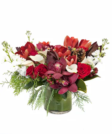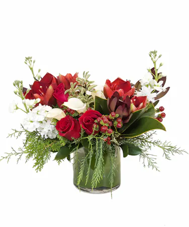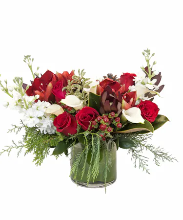 A low-style cylinder design featuring roses, calla lilies, amaryllis, stock, berries and more. The perfect way to wish them a happy holiday season!
