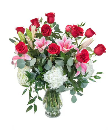 Our 'All My Love' arrangement is designed with long stem red roses, fragrant pink lilies and white hydrangeas in a tall, clear glass vase. A classic design.