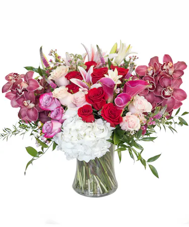This bountiful design features roses, cymbidium orchids, hydrangeas, calla lilies and more. It is full of beauty!