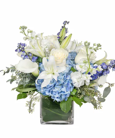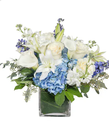 Timeless beauty and elegant style come together in this arrangement of white roses, white lilies, blue delphinium and more, in a modern glass cube vase.
