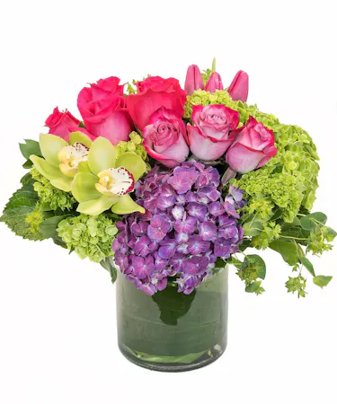 Feminine flowers in shades of pretty pinks, purples & greens brighten her day - and her feng shui. She'll love the beautiful serenity and balanced, Zen-like feel of the lush pink and green blooms. A wide array of flowers are presented in a clear glass cylinder vase that's lined with green ti leaves. Blooms include green hydrangea, purple hydrangea, green cymbidium orchids, hot pink roses, lavender roses & tulips.