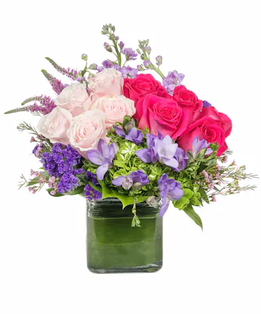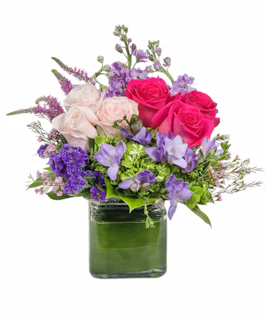 This exquisite mix of feminine blooms is like a breath of fresh air! Sweet pinks and lavenders are contrasted with a modern burst of fresh green hydrangea. Lavender stock, veronicas, and pink roses. It's a fun pick-me-up to send anytime, anywhere!