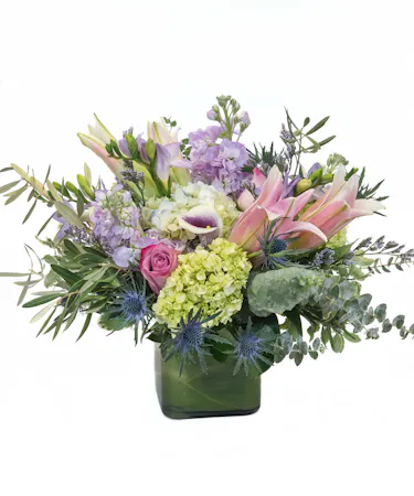 Includes flowers such as oriental lilies, roses, thistle, hydrangea, calla lilies and assorted greenery.
