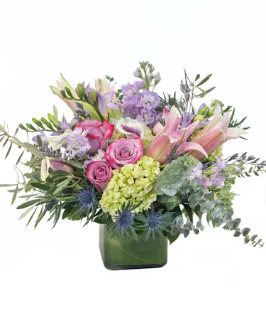 This exquisite floral arrangement is a symphony of colors and textures, perfect for expressing your deepest sentiments. The centerpiece features elegant orchids (premium) and delicate lilies, symbolizing love, beauty, and purity. These are artfully complemented by the soft hues of roses, creating a harmonious blend of elegance and charm. Adding a touch of whimsy are the playful blue thistle accents, while lush greenery provides a natural backdrop for this enchanting composition. Presented in a stylish glass cube vase, this arrangement is sure to make a lasting impression on any occasion.