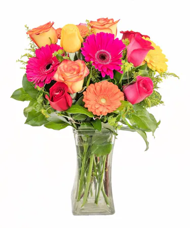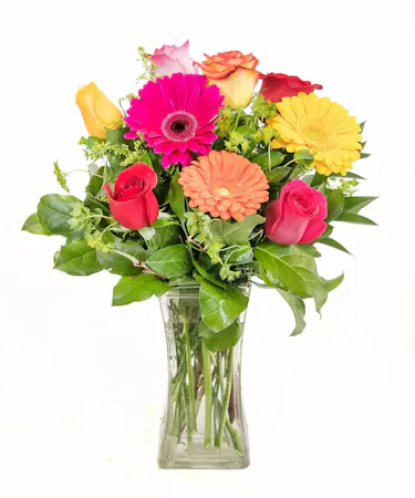 A beautifully bright and colorful way to spread sunshine and cheer. Assorted roses and gerbera daisies in their most brillliant hues create a stunning bouquet accented with yellow solidago and assorted greens. Arriving in a clear glass vase, this bouquet is a sweet way to light up their life.