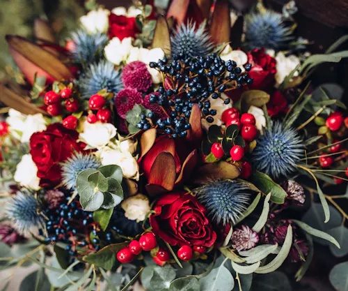 The winter months wrap us in a palette of whites, reds, greens, blues, and dazzling metallics. It's a combination that feels timeless and full of wonder. Crisp white blooms like anemones, orchids, and poinsettias echo the stillness and purity of snow-covered mornings, as well as the tranquility we're eager to find this time of year. Cool blues add a layer of peace and calm, creating spaces that feel like a retreat from the holiday hustle and bustle. Red, the ultimate color of winter warmth, is found in bold roses, dramatic amaryllis, and classic poinsettias. Whether crimson, ruby, or cherry, red brings feelings of passion, energy, and excitement to our lives.