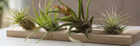 Air plants, also called Tillandsia, come in many shapes, sizes, and varieties. However, they all share a similar feature: Air plants don't need soil to grow. They get all their nourishment from the air and use roots only to attach to a surface. For that reason, you can place air plants on nearly any stable spot in your space or nestle them in a terrarium. Note that bathrooms or kitchens are preferable locations as air plants tend to enjoy warm, humid conditions. Their typical appearance features strap-like leaves arranged in a rosette shape, with fresh growth emerging from the plant's center. Some say air plants resemble alien lifeforms or deep sea creatures like octopi.